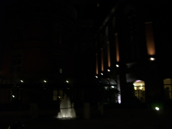A dark view of a fountain and a city street at night, the fountain is white and a building has some lights that throw up verticle patterns.
