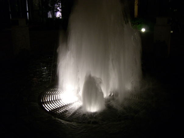 Misty white water fountain at night.