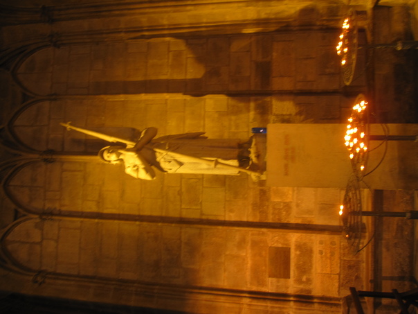 Large white statue of a person holding a staff of some kind with their hands pressed together. |