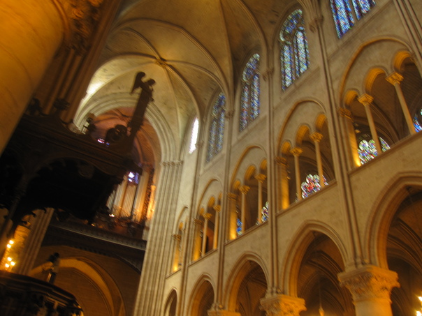This image shows the colorful strained glass windows, arches, and pillars of the interior of a brightly lit cathedral or church. |