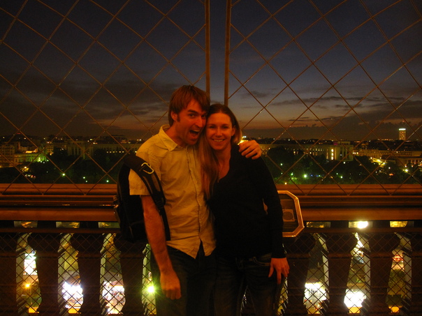 Tourists are excitedly having their picture taken above the bright city lights. |