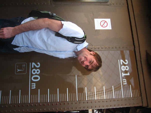 This is a man wearing a white shirt standing next to a wall measurement and a no smoking sign. |