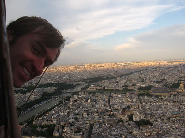 A man is sticking his head into the camera frame at an overlook of a large city. |