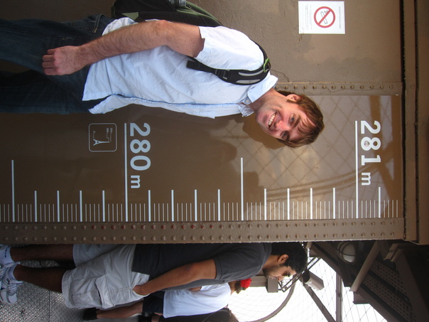 A smiling man with a backpack stands against a metric measure of his height above ground. |