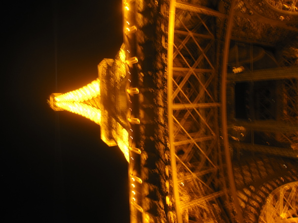 The view of someone looking up at an illuminated Eiffel Tower. |