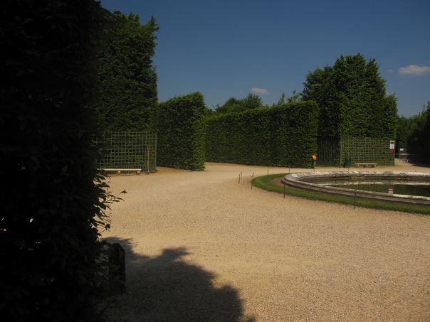 A gravel path in a beautiful park with very tall bright green hedges. |