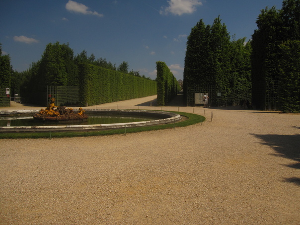 Greenery surrounds a gravel lot with a elegant pond in the middle. |