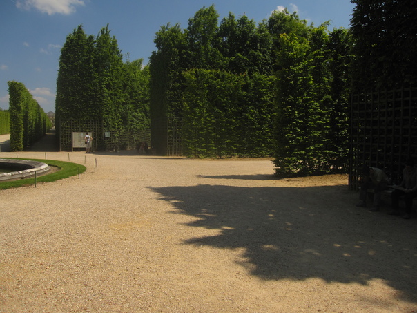 Image is centered on a gravel road with large maintained bushes forming walls surrounding the road. |