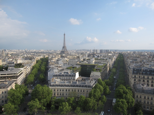 An overhead view of a city, it has two rows of trees, and in the distance appears to be the Eiffel Tower. |