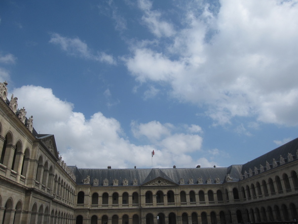 The top part of the buildings making up the Louvre on a partly cloudy day. |