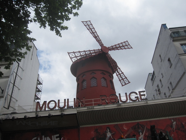 This is a photo of the red Moulin Rouge windmill that sits atop the famous Paris cabaret. |