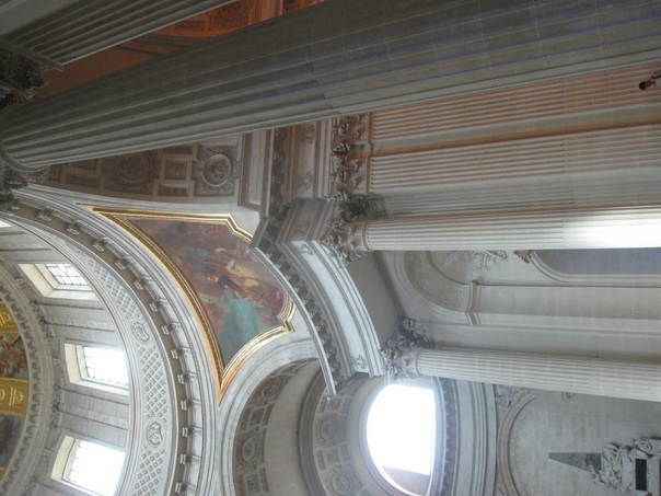 This is the interior of an old building with tall columns, and painted murals on the walls and ceiling. |