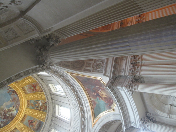 This is a picture of a cathedral rotunda which has white stone pillars and relief paintings trimmed in gold. |