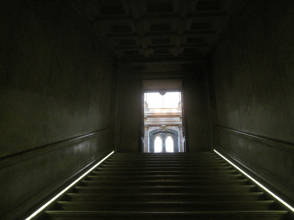 Light shines through an open doorway at the top of a staircase. |
