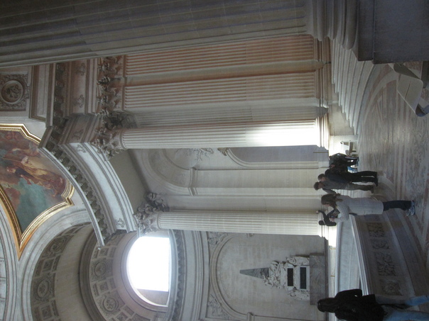 People stand inside a tall, ornately decorated old building with paintings on the ceiling. |