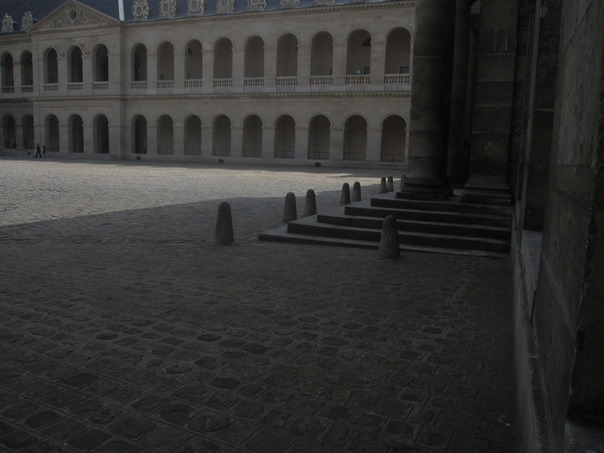 The cobblestone walkway leads to the stairs of the great stone building. |
