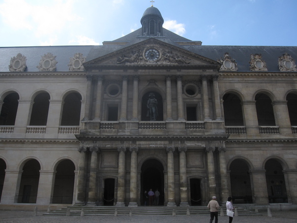 Large Building with great arches. A central clock on the entrance. Tourists are walking about the outside and in the interior of the building. |