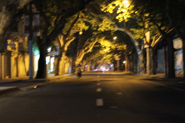 Blurry picture of a tree-lined street at night with someone on a bike approaching the photographer.