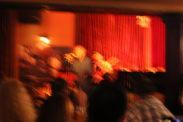 A very blurry picture of what looks to be two people singing.