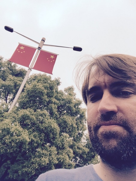 This guy takes a picture below a Chinese flag hanging from a light pole