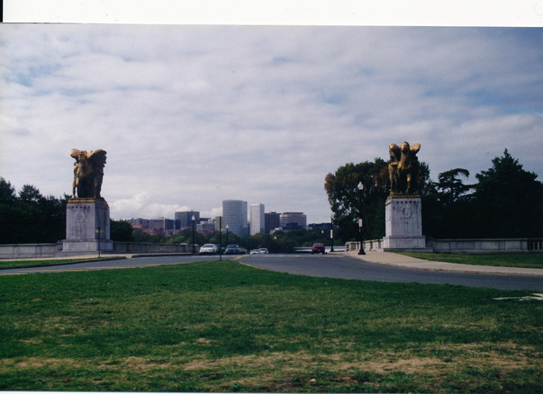 Larger than life, elaborate statues frame this roadway in a city. |