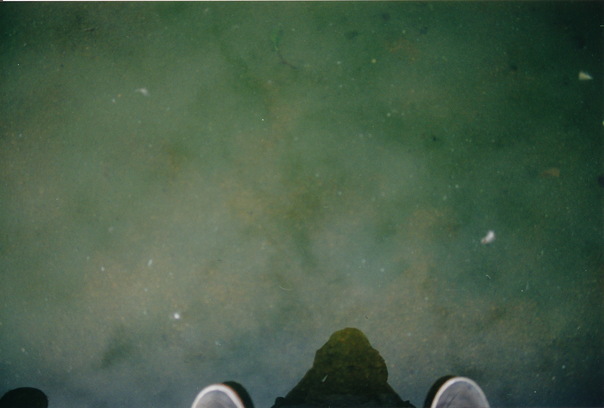 It is a person's reflection on the ground of them taking a picture of them self. |