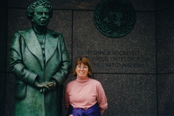 A woman in a pink turtleneck and glasses smiling while standing next to a statue of Eleanor Roosevelt. |