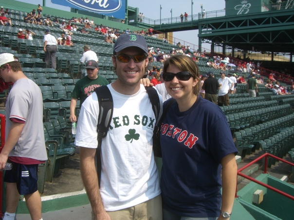 This is a photo of a couple taken at a Boston Red Sox game on a pretty sunny day. The stands are just starting to fill up.