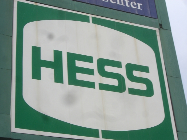Signage for the Hess Gasoline station. Green Letters in a white cylinder shape.