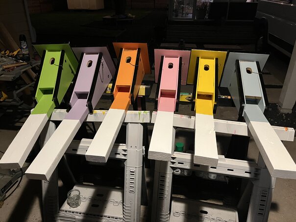 Before heading off on the trip to Asheville, I wanted to make sure that all of the birdhouses were entirely touched up and then I wanted to make sure that the stems were painted so that they would last forever (without the wood rotting out).