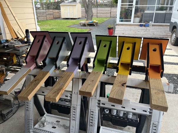 Before heading off on the trip to Asheville, I wanted to make sure that all of the birdhouses were entirely touched up and then I wanted to make sure that the stems were painted so that they would last forever (without the wood rotting out).