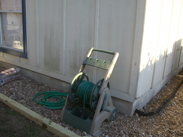 There is a long grass green hose wrapped around an opaque green wheel attached to a stand in front of a white garage/shed.