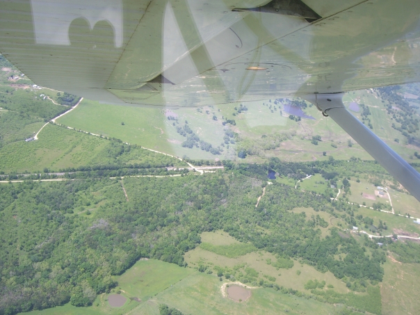 Arial view of farmland, roads, lakes and woods from a small airplane