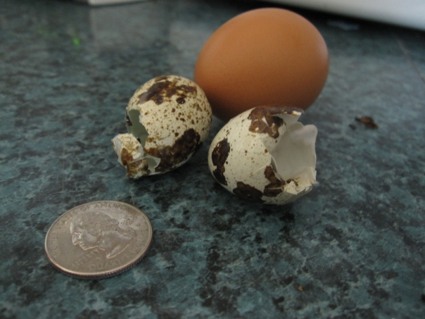 A quarter is on a surface by two cracked eggs and one uncracked egg.