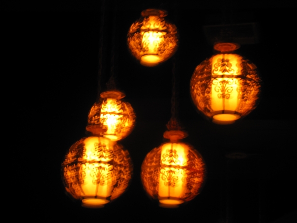 Five decorative candle lanterns hanging from chains in a dark area.