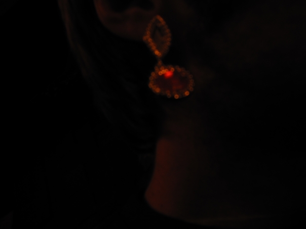 An out of focus hand holds up a blurry looking earring that has white gems lining the outside, a red oval shaped gem on the bottom, and a blue diamond shaped gem on top.