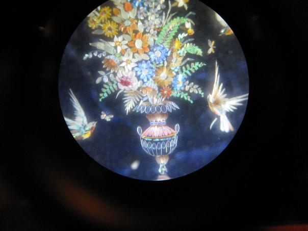 This is a circular picture of a colorful bouquet of flowers in fancy vase with two birds flying near the bottom.