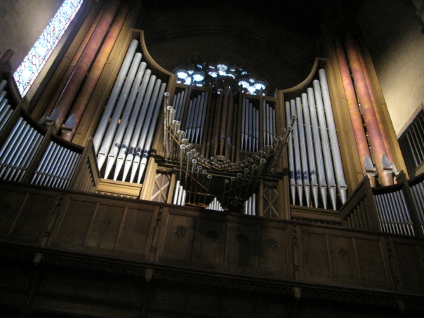 Organ pipes all in a row reach up towards a stained glass ceiling in a cathedral.