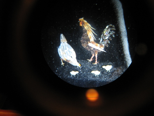 In looking through the lens you will see a rooster, a hen, and three baby chicks pecking at the ground.