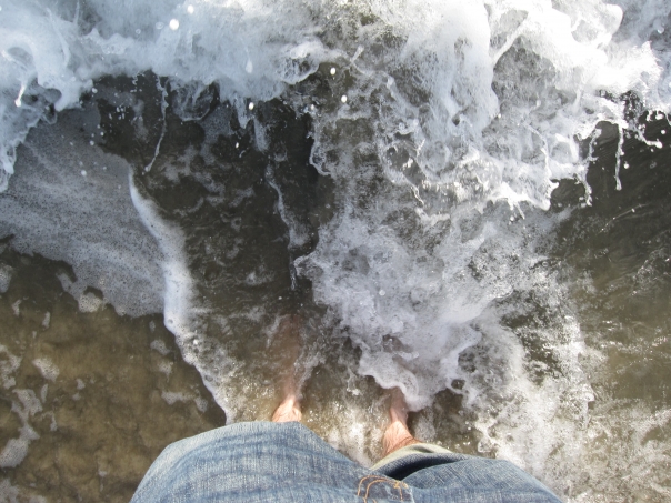 Water rushes in and pools around the feet of a person wearing jeans and standing in the sand.
