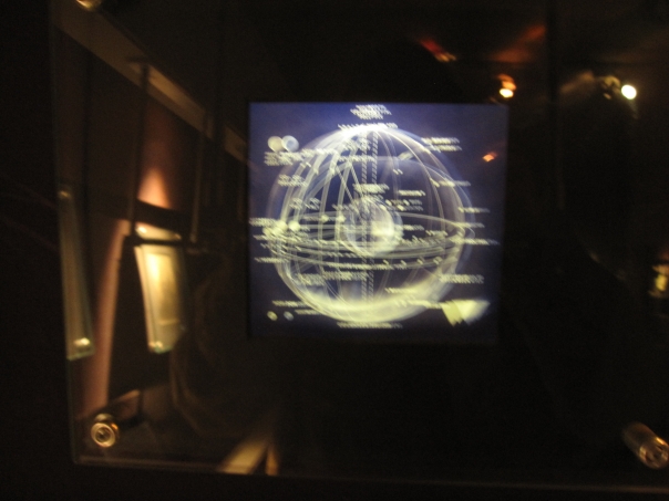 A blurry, dark photo shows an illustration of a planet.