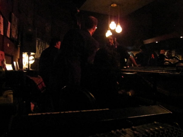 This is a very dark picture of people talking in a bar with three round globes in the background.
