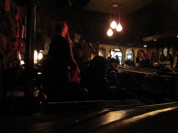 It is very dark and gloomy at night in an urban setting, a band appears to be playing, and three lights hang from the ceiling.