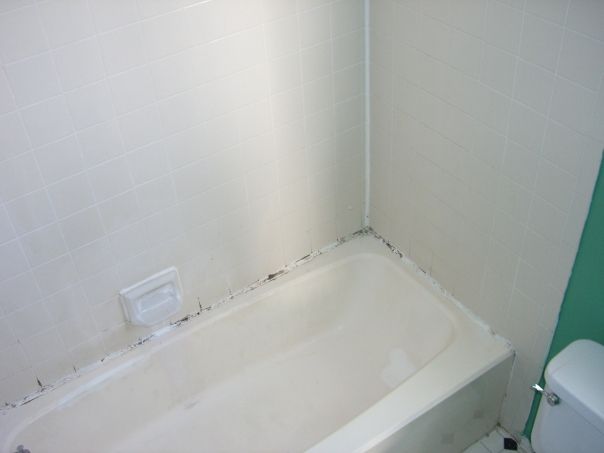 In the bathroom, the bathtub has mildew in the grout along the surround.