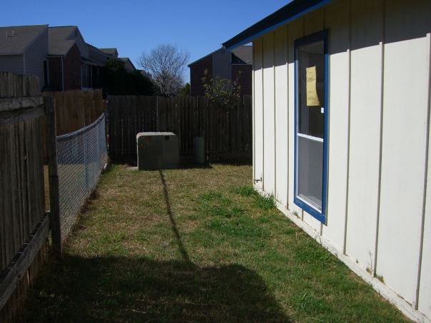 A single utility unit sits at rear, narrow side yard of a white building with blue framed window.