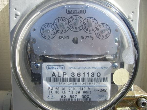 An electric meter with a lot of numbers and a dial running through its middle.