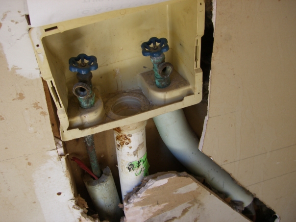 Two faucets that appear to not be working properly. There are some exposed pipes and the brown wall is cracked and broken. The middle white drain pipe is dirty and has chunks of dirt on it.