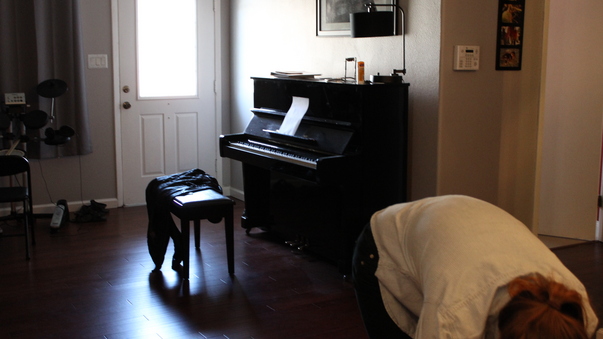 A person touching their toes in front of an upright piano and bench.