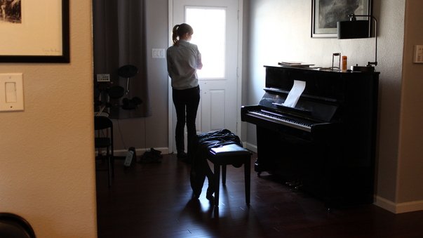 A woman staring out the window on a door as she stands in front of a black piano and bench.