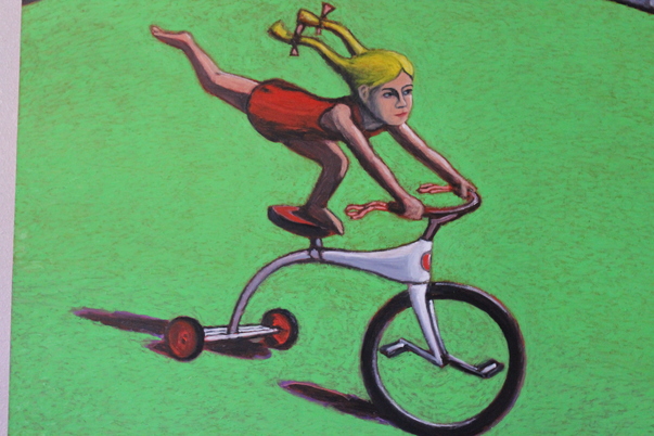 A barefooted young blonde girl in pigtails successfully performs a stunt on a tricycle with one foot in the air.